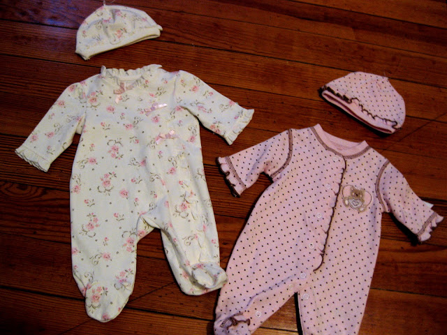 The girls are measuring 4.5 inches long, and weighing in at 5 oz each! It’s hard to believe how fast they’re growing each day! My mom got so excited, she went out and bought two tiny girly outfits and mailed them to us. Both very similar and lady-like, but not too matchy-matchy… perfect! Nick walked around with one in each arm, like there were actual babies inside. SO cute.