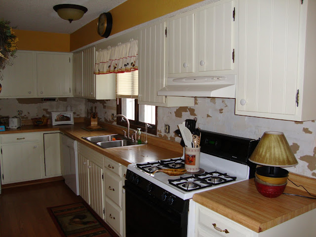 Alice and her hubs have been doing some updating to their home, and lucky for us, that included a brand new painted backsplash!! In fact, they tore out actual tile for us to custom paint it to their specifications! Granted, the previous tile was old sterile-white ceramic tile, probably original to the house.