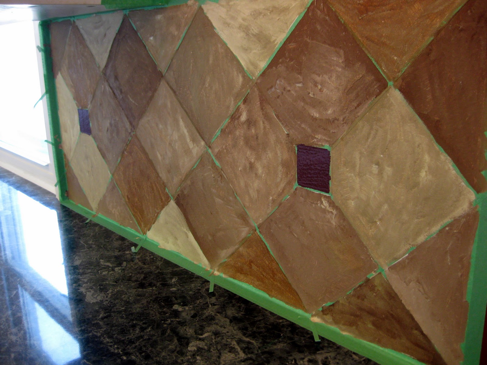 She wanted to stick with medium neutrals, but add a pop of eggplant in the vertical accent squares to coordinate with a future accent wall. It’s kinda hard to see the colors in the photos.