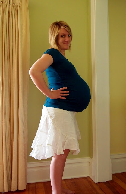 Well, I’m still pregnant. Should be for another 3 weeks if the Doc has his way. Girlfriends are about 5.5 lbs and doing the river-dance on my pelvic floor. My skin has stretched to epic proportions. My swelling could be documented in the Guiness Book of World Records. I have 3 suitable maternity shirts remaining. At home, I wear Nick’s basketball shorts and XL T-shirts that still aren’t long enough to cover the bottom of my belly. Kinda makes a girl feel a little trashy!