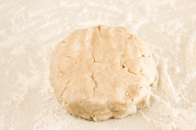 3. Cut into 4 pieces. You will have enough dough for the top and bottom of 2 pies. Take one of the quarters and roll it into a ball and then flatten it with your palm. Flour the top and start rolling from the middle, turning a quarter turn with each roll.