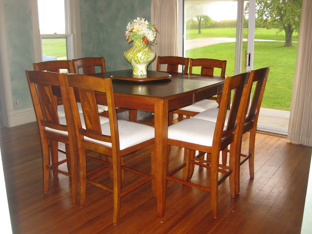 Since we haven’t gotten much rain the last couple weeks, Nick has gotten to take a break from mowing. We’ve been spending a lot of time fixing things here and there, and tending to our 5 acre lawn (including but not limited to: shooting ground squirrels, trapping moles and beating them to death with a shovel, pruning plants that Reuben destroys, picking up little pieces of garbage that Reuben brings up from the burn pile and shreds into a million pieces). We’ve painted both bathrooms, installed a new kitchen faucet, and on Sunday, we bought a dining room table!! Our dining room was the one space that made our house feel incomplete. It just sat there. Vacant. With it’s perfect hardwood floors. So I’ve been checking craigslist from time to time to see if there any good deals on dining room tables, and we found this one!! It’s exactly what I was looking for! I love the way it’s much higher than a regular table, and how it’s square with clean lines. Very classy, yet modern!! Next on the agenda is to paint the dining room walls and put up crown molding. It just might be one of my favorite rooms in the house!! Anyone up for a dinner party?!