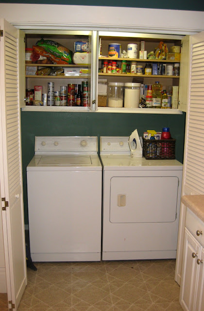 Now, adjacent to the refrigerator is this bizarre laundry/pantry. In a perfect world, laundry and pantry would never be used in the same sentence, let alone be forced to inhabit the same nook in my kitchen. I dream of a day when this whole space will be lined with shelves, and stocked with an abundance of food. It’s not easy trying to shove a months worth of food into these two cabinets.