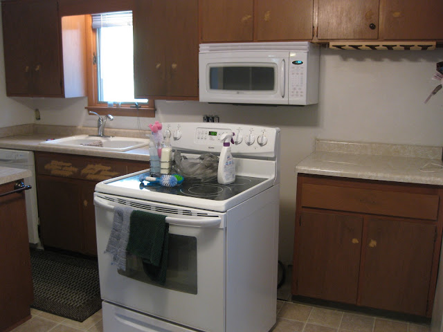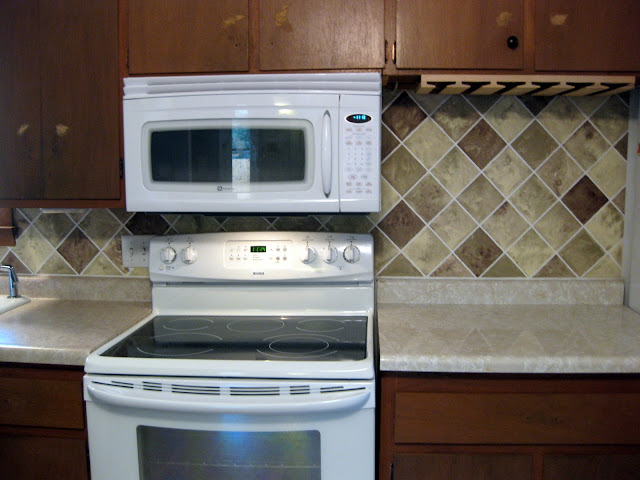 Jamie and her hubs have revamped just about every other room in their house EXCEPT the kitchen. It’s an understandably intimidating room to tackle, and can be very expensive. But it doesn’t have to be. We slapped some paint on the backsplash… and next weekend, Jamie and her husband are gonna slap some paint on their cabinets (hence the lack of hardware and wood putty all over the cabinet faces). So our ‘after pictures’ aren’t truly after pictures, but you can use your imagination.