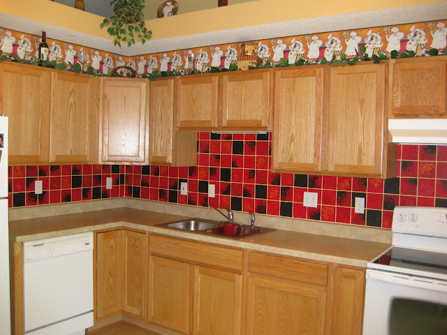 Our new friend, Kim, found it necessary to spice up her already spicy ‘Fat Italian Chef’ themed kitchen by hiring us to paint her backsplash. I’ve been hoping and praying for quite some time for someone to be even more obnoxious than I, and feel the need to do something crazy with the colors of their backsplash. The reason for this is, in part, to see how awesome it looks. But also to show the world how versatile the painting of backsplashes can truly be!! So by request… this is her ‘Red, Black and Orange’ backsplash!! I’m happy with the results, and we’re pretty sure our crazy friend Kim loves it too!