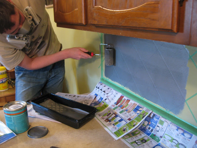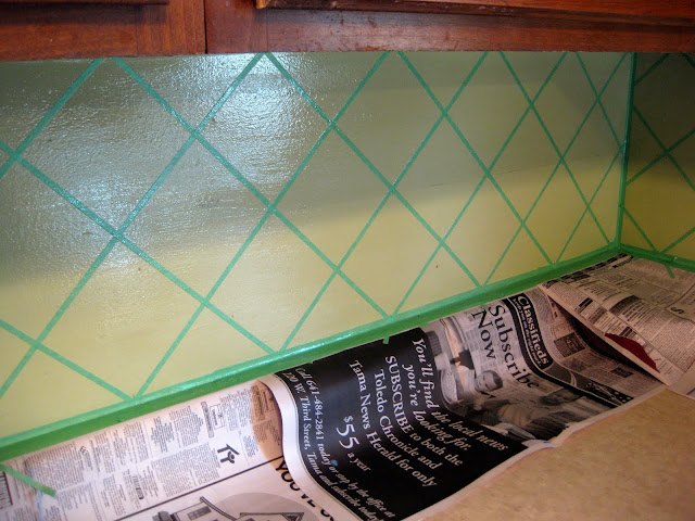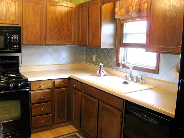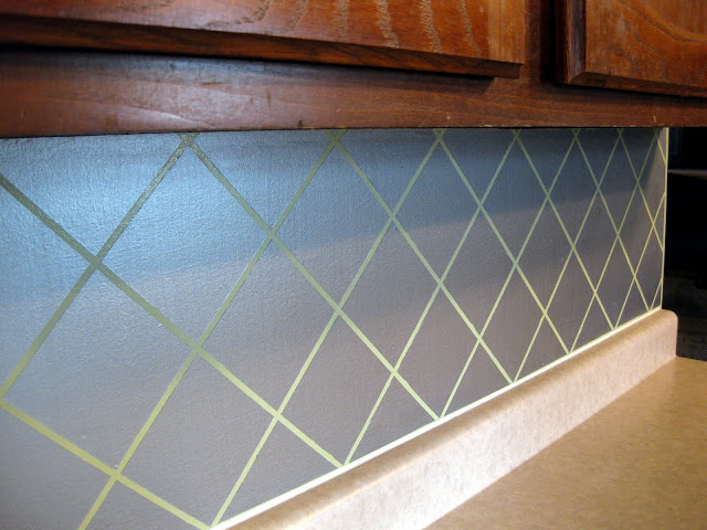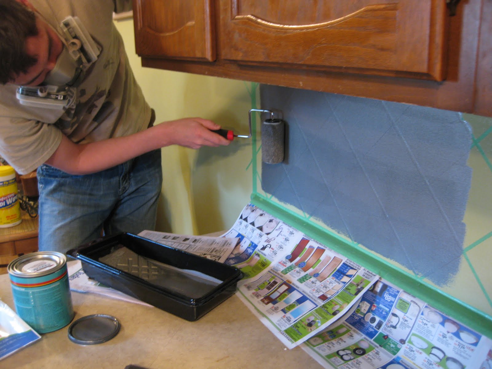 The silver-chrome-ish paint was quite runny, and therefore we worried that there would be a lot of leakage under the tape. And because unlike natural tumbled “stone” tiles, stainless tiles HAVE to have a crisp edge. We did some practicing at home on a piece of wood that had been primed and painted, which helped our confidence a little. Here’s Pam’s kitchen before: