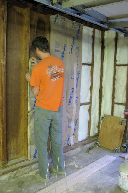 Next winterizing item on the agenda is the issue of climate changes within our work area. If you knew that I wear socks to bed year ’round, you would know that I’m cold blooded and don’t deal well when temps drop below 65. Not to mention the fact that wet paint does weird things when it’s cold. Not to mention Blanche and Lucile live in the garage and will likely appreciate livable temperatures. Not to mention, a dry-walled garage just looks better. So we’ve begun insulating!